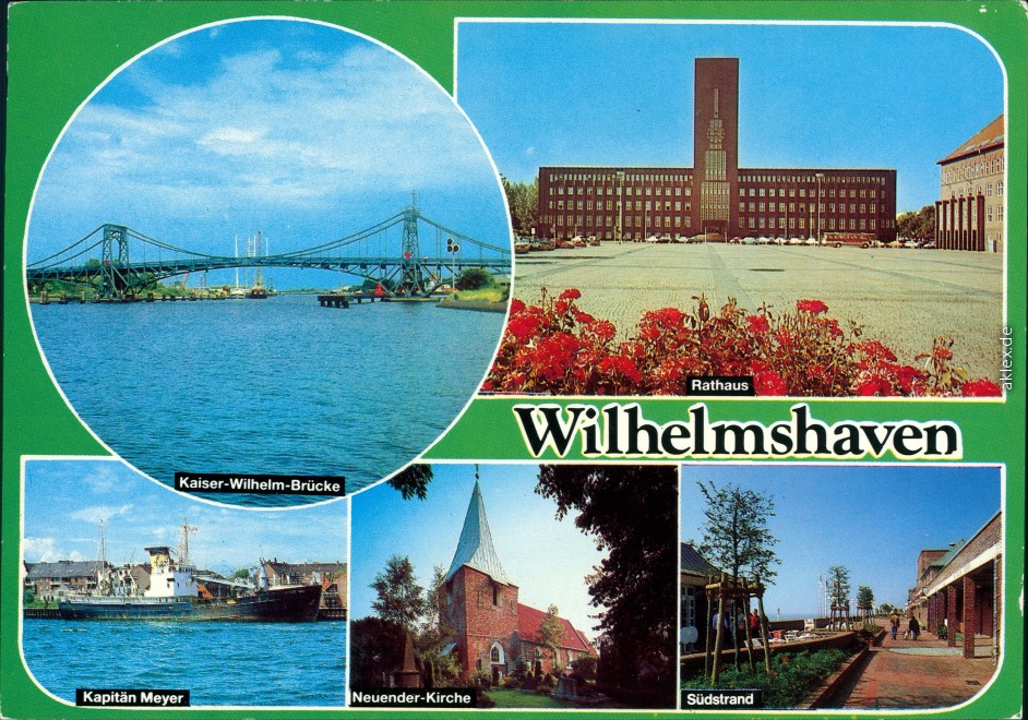 Postcart: Kaiser-Wilhelm-Brücke, Rathaus, Kapitän Meyer, Neuender-Kirche, Südstrand - Wilhelmshaven