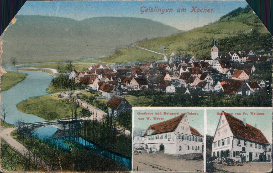 Postcart: OT Geislingen am Kocher: Blick auf die Stadt, Gasthaus, Handlung - Braunsbach