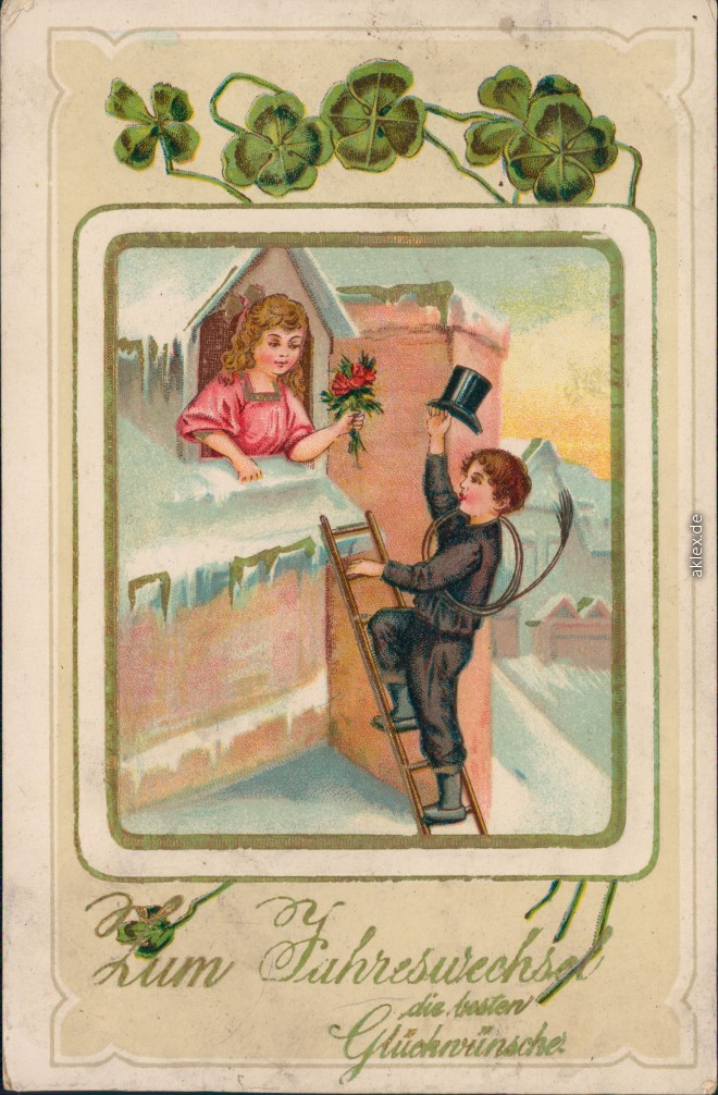 Postcart: Glückwunsch - Neujahr: Schornsteinfeger, Frau, Kleeblatt