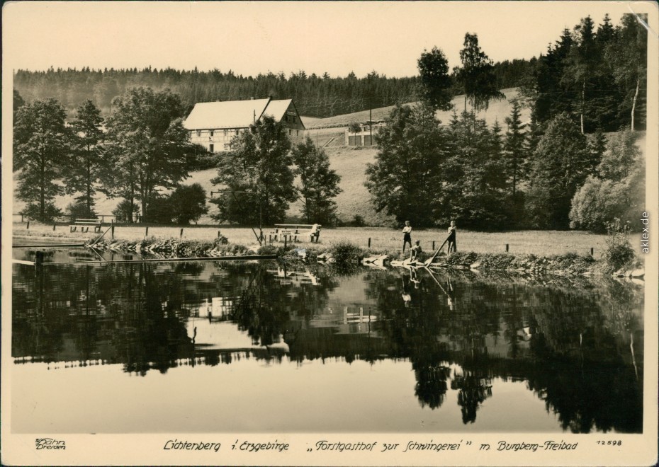 Postcart: Forstgasthaus zur Schwingerei mit Burgberg-Freibad - Lichtenberg (Erzgebirge)