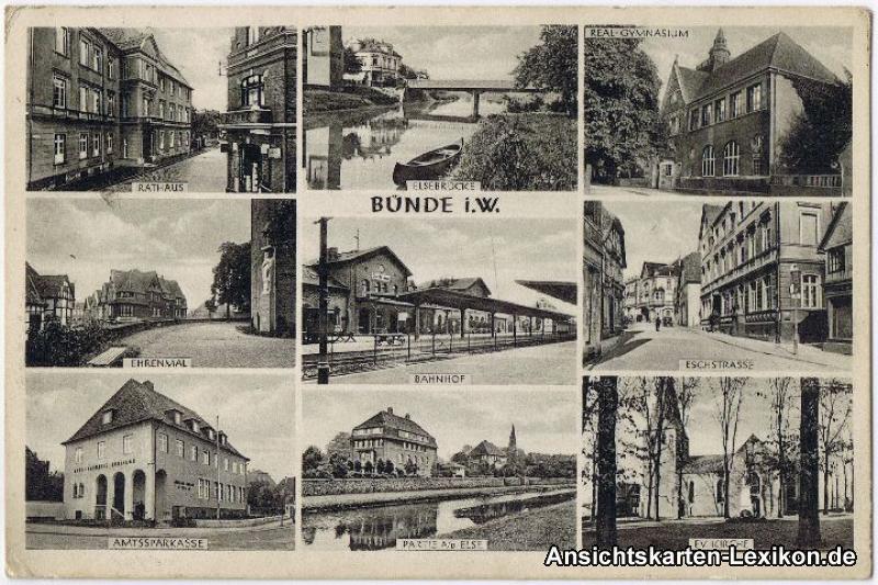- Rathaus -- Elsebrücke --Real-Gymnasium -- Ehrenmal -- Bahnhof -- Eschstraße -- Amtssparkasse -- Partie an der Else -- Evangelische Kirche