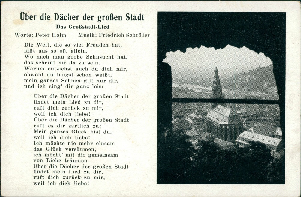 - Über die Dächer der großen Stadt Das Großstadt-Lied Worte: Peter Holm Musik: Friedrich Schröder Die Welt, die so viel Freuden hat, läßt uns so oft allein. Wo nach man große Sehnsucht hat, das scheint nie da zu sein. Warum entziehst auch du dich mir, obwohl du längst schon weißt, mein ganzes Sehnen gilt nur dir, und ich sing' dir ganz leis: Über die Dächer der großen Stadt findet mein Lied zu dir, ruft dich zurück zu mir, weil ich dich liebe! Über die Dächer der großen Stadt ruft es dir zärtlich zu: Mein ganzes Glück bist du, weil ich dich liebe! Ich möchte nie mehr einsam das Glück versäumen, ich möcht' mit dir gemeinsam von Liebe träumen. Über die Dächer der großen Stadt findet mein Lied zu dir, ruft dich zurück zu mir, weil ich dich liebe!
