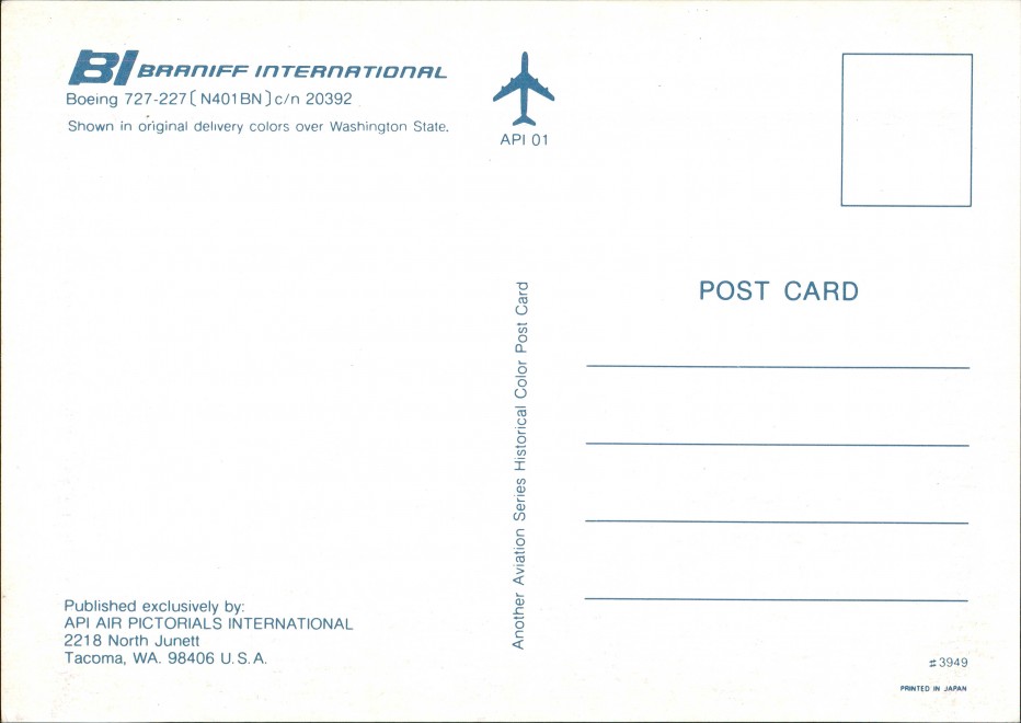 Postcart: Boeing 727-227(N401 BN c/n 20392 BRANIFF INTERNATIONAL Flugwesen - Flugzeuge