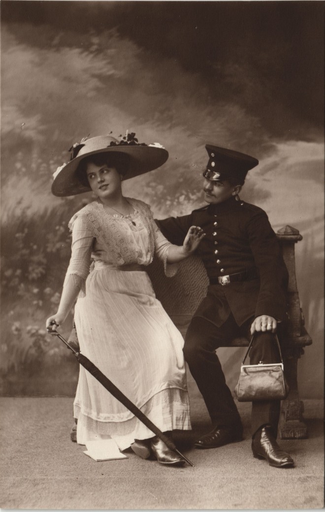 - Soldat und freine Frau auf Bank Militaria Atelierfoto
