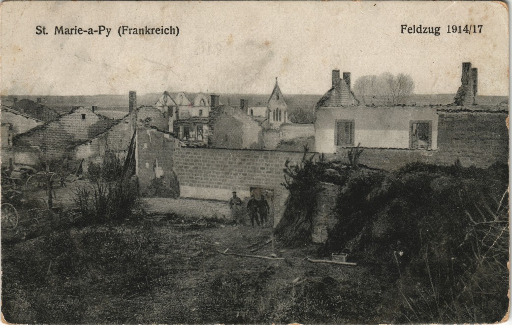 Postcart: zerstörte Stadt gel Feldpost WK1 - Sainte-Marie-à-Py