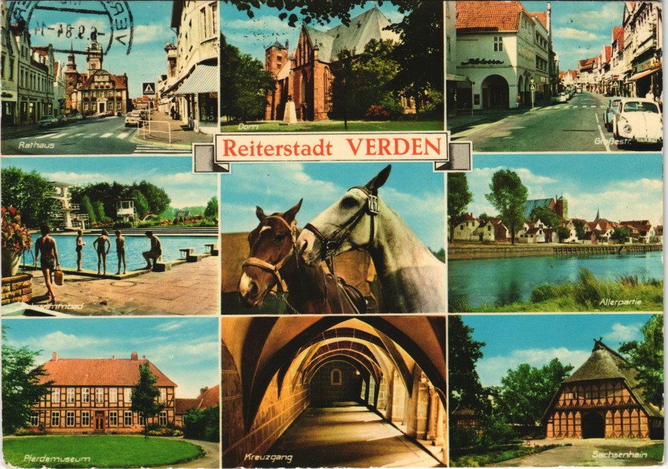 Photo Card: Mehrbild-AK mit Schwimmbad, Pferde-Museum, Strassen, Rathaus - Verden (Aller)