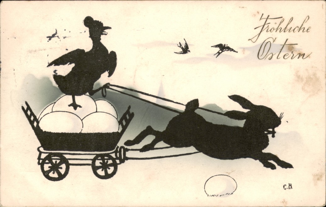 Postcart: Ostern / Easter Schattenschnitt Osterhase zieht Wagen mit Henne