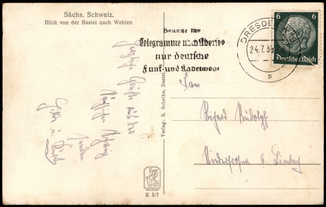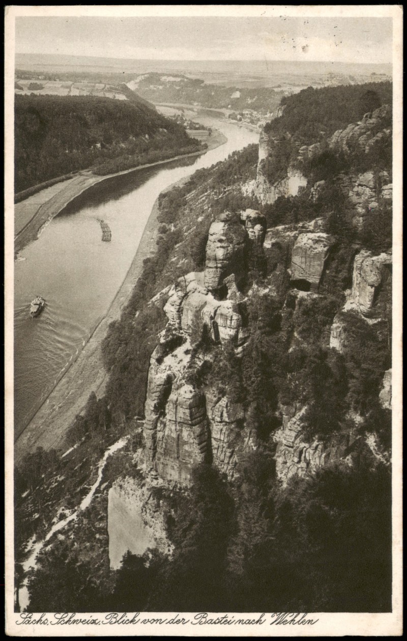 Postcart: Blick vom Basteifelsen - Dampfer - Rathen