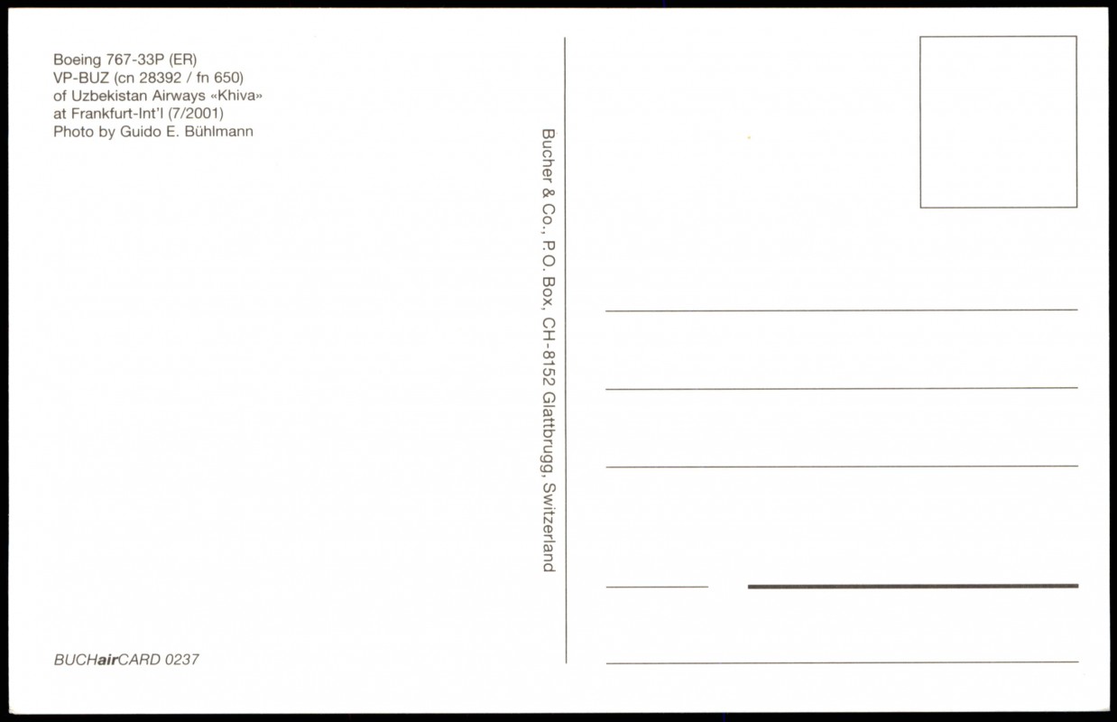Postcart: Uzbekistan Airways «Khiva Boeing 767-33P (ER) Flugzeug Airplane Avion