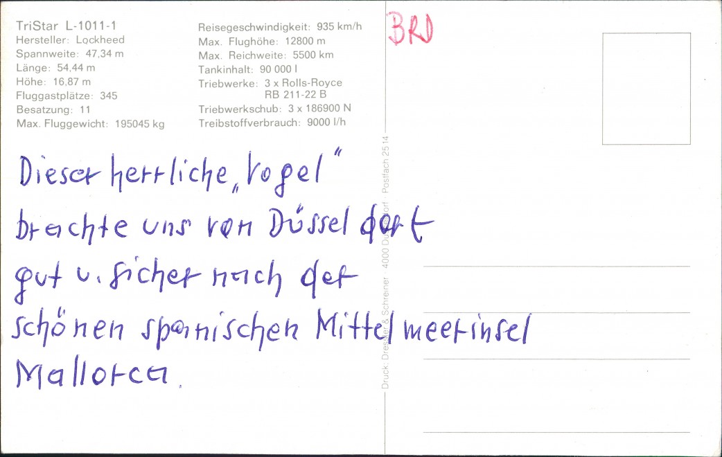 Postcart: Lockheed TRISTAR L-1011-1 Flugzeug Airplane Avion LTU