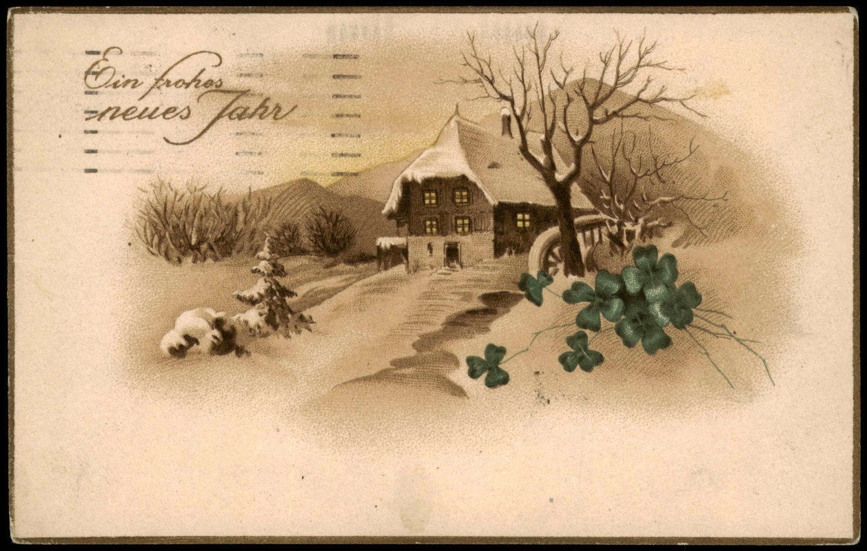 - Neujahr Sylvester New Year Motiv: Verschneites Haus, Kleeblatt
