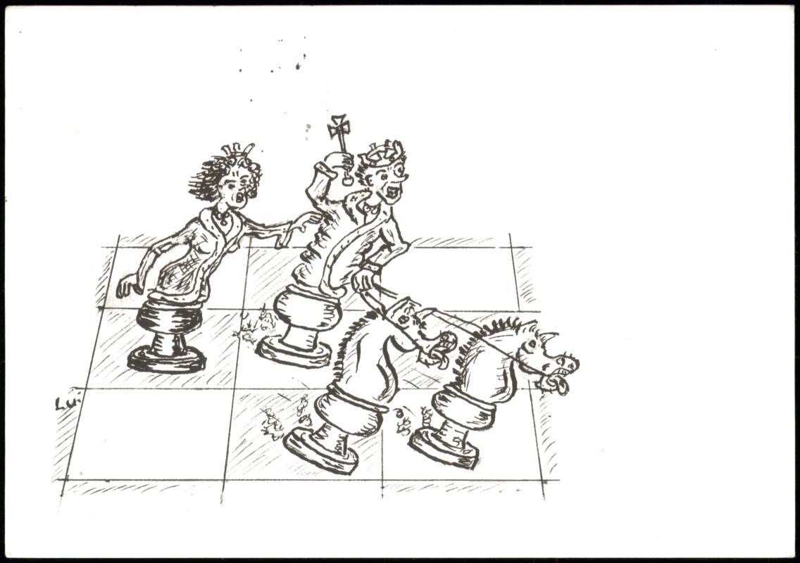 Postcart: Schach-Spiel (Chess) Motivkarte Illustration einiger Spielfiguren