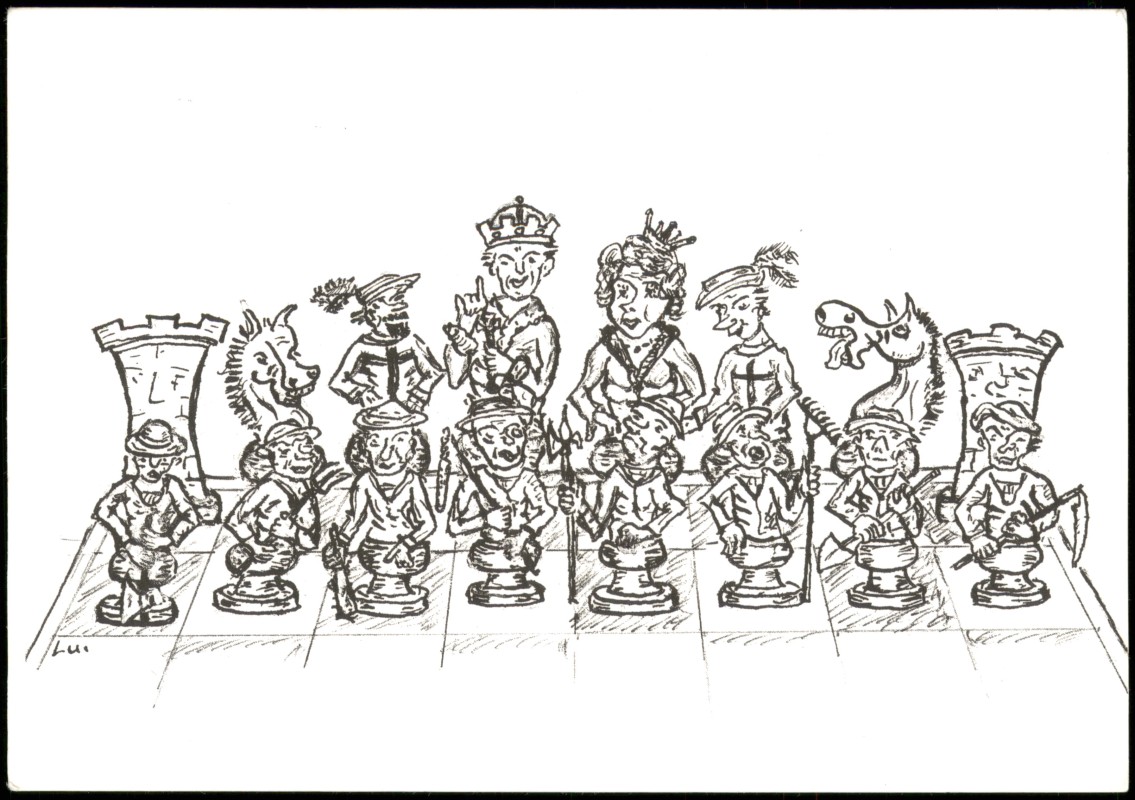 - Schach-Spiel (Chess) Motivkarte Zusammenstellung div. Spielfiguren