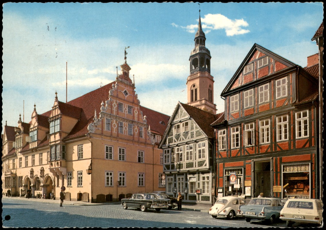 Postcart: Rathaus und Stadtkirche, VW Käfer - Celle