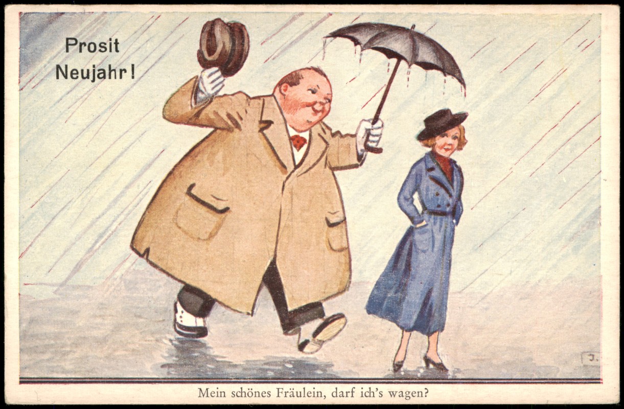 Postcart: Neujahr Sylvester New Year Mann hält Frau den Regenschirm