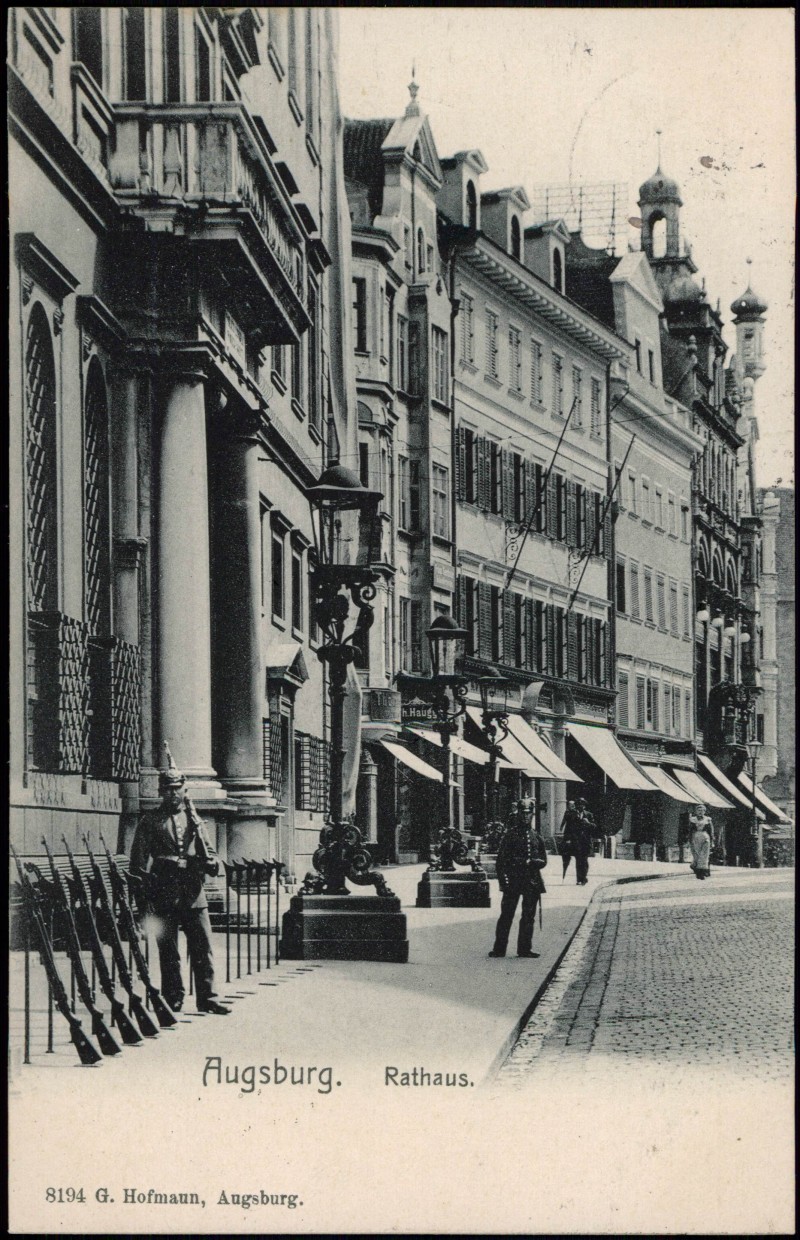 Postcart: Rathaus, Straßenpartie mit Wache und Geschäften - Augsburg