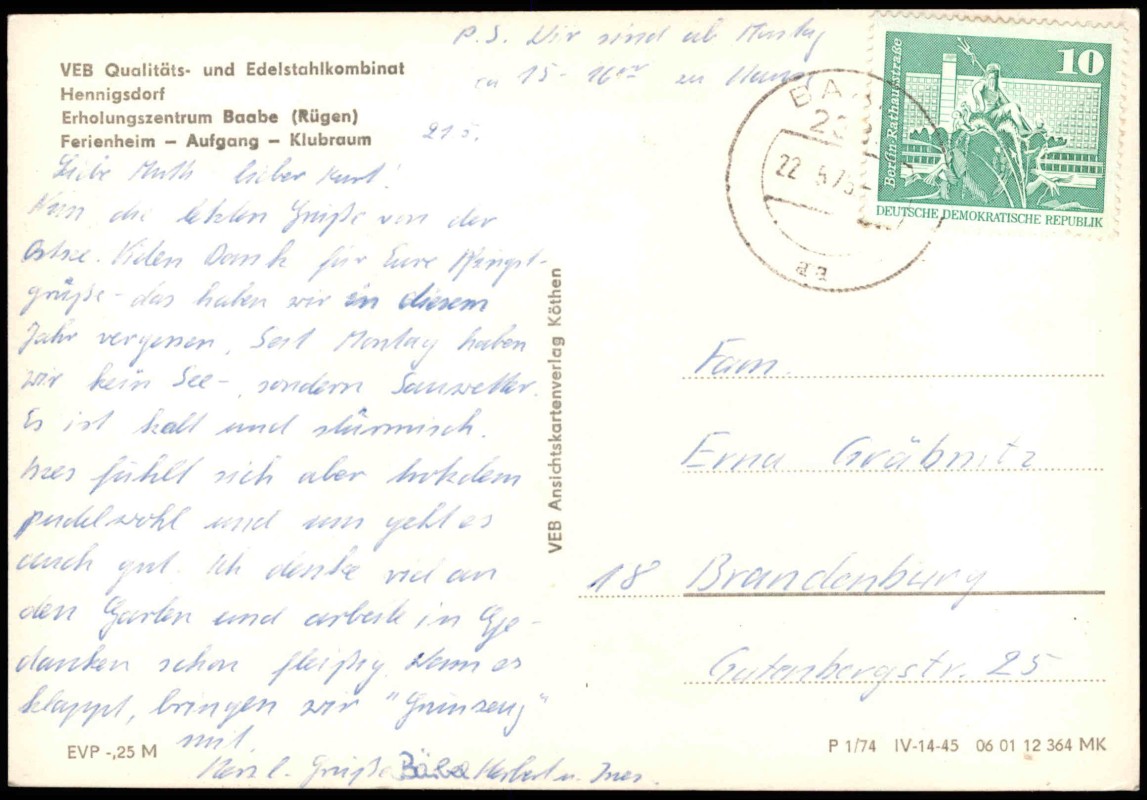 Photo Card: DDR AK Erholungszentrum VEB Qualitäts- u. Edelstahlkombinat Hennigsdorf - Baabe Rügen