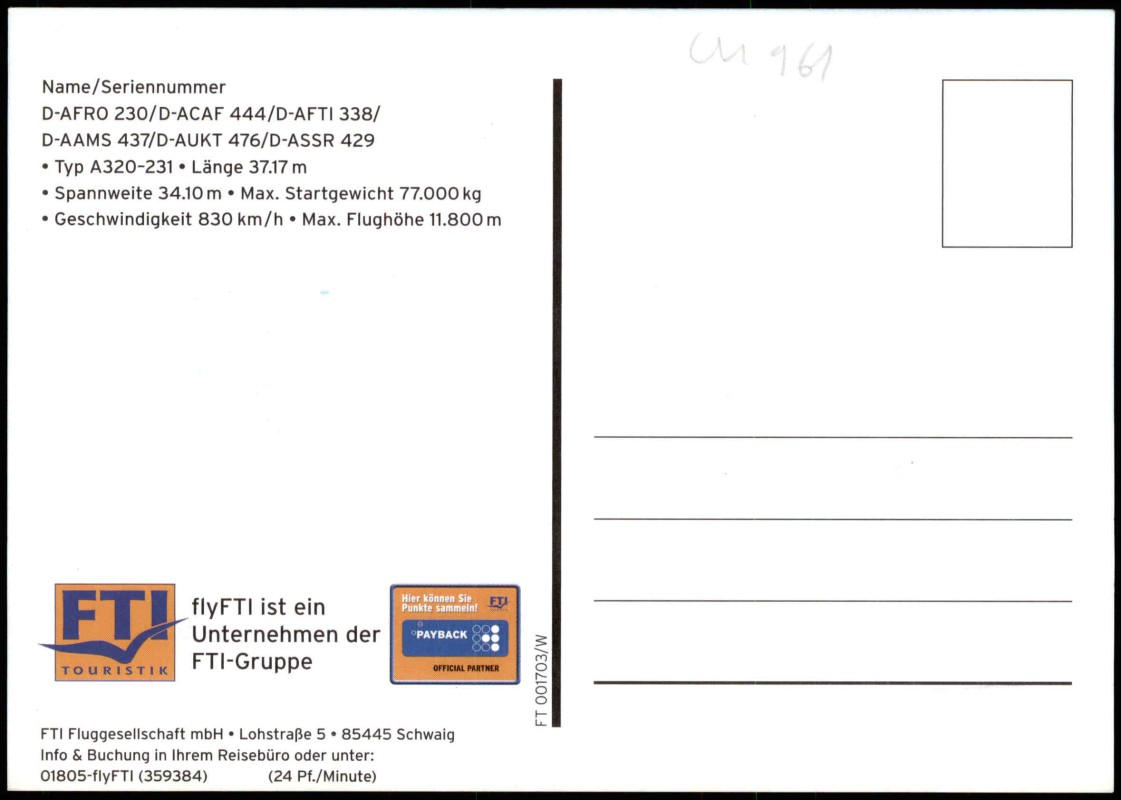 Photo Card: Flugzeug Airplane Avion FTI Ferienflieger