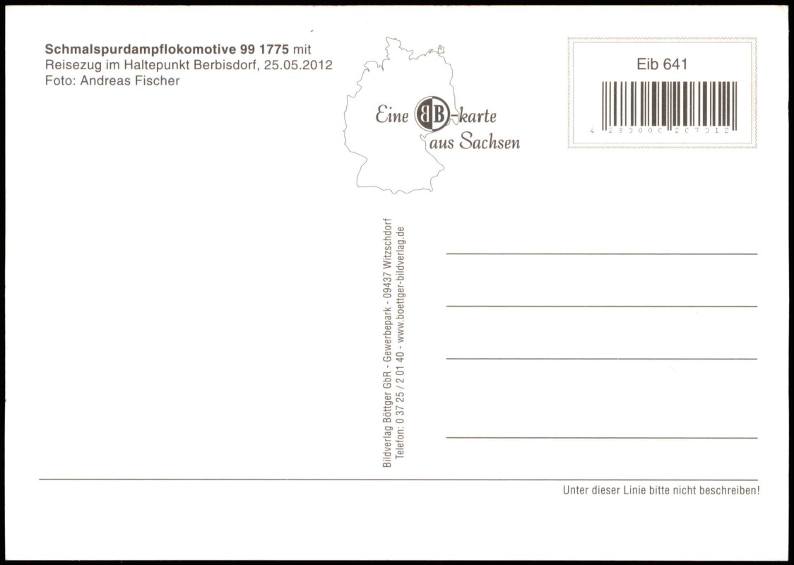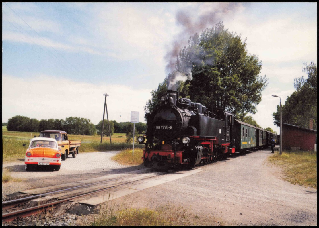Photo Card: Schmalspurdampflokomotive 99 1775 mit Reisezug im Haltepunkt Berbisdorf
