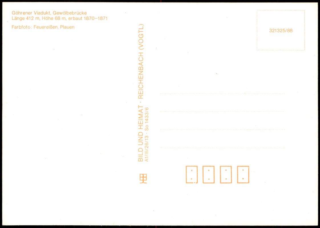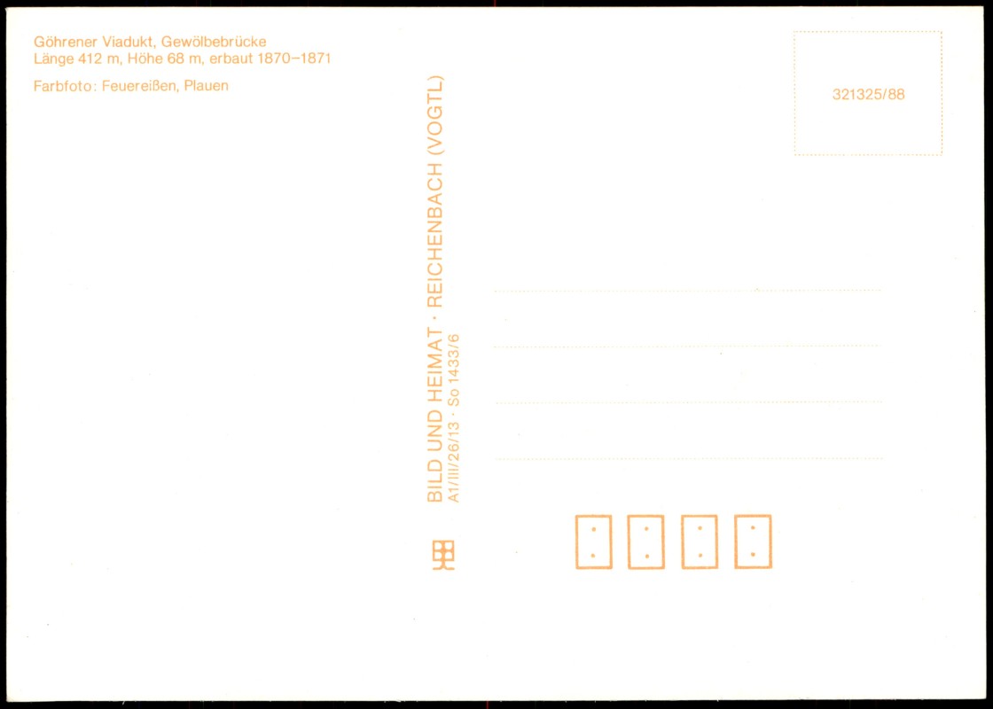 - Die Postkarte zeigt den Göhrener Viadukt, eine imposante Gewölbebrücke mit einer Länge von 412 Metern und einer Höhe von 68 Metern, die zwischen 1870 und 1871 erbaut wurde. Im Vordergrund fährt eine rauchende Dampflokomotive auf den Gleisen. Das Farbfoto stammt von Feuereißen, Plauen. Die Karte wurde vom Verlag BILD UND HEIMAT aus Reichenbach (Vogtl) herausgegeben, mit der Seriennummer So 1433/6.