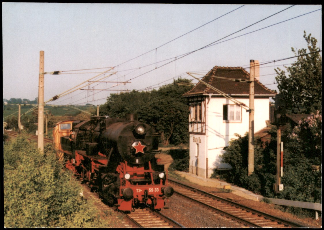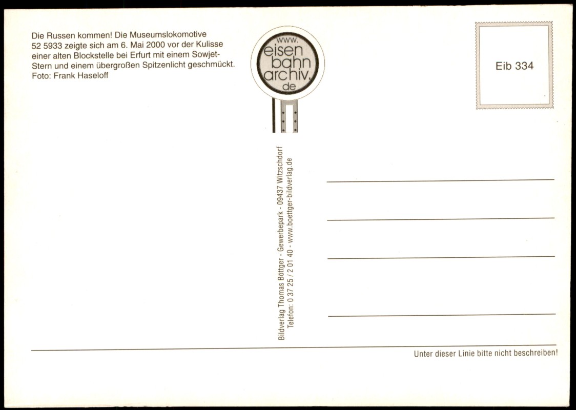 - Die Museumslokomotive 52 5933, geschmückt mit einem Sowjet-Stern und einem übergroßen Spitzenlicht, wurde am 6. Mai 2000 vor der Kulisse einer alten Blockstelle bei Erfurt fotografiert. Das Foto stammt von Frank Haseloff. Herausgegeben vom Bildverlag Thomas Böttger, Seriennummer Eib 334.