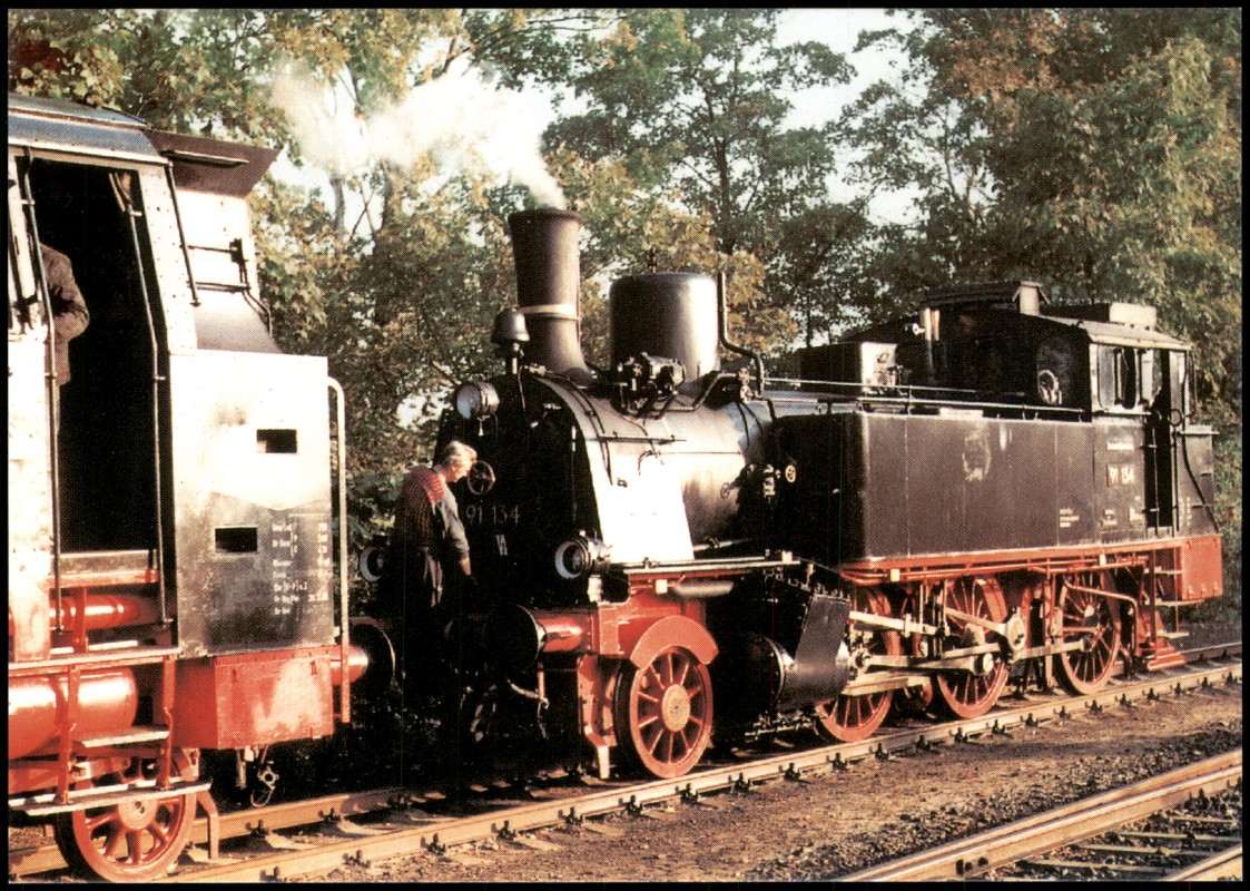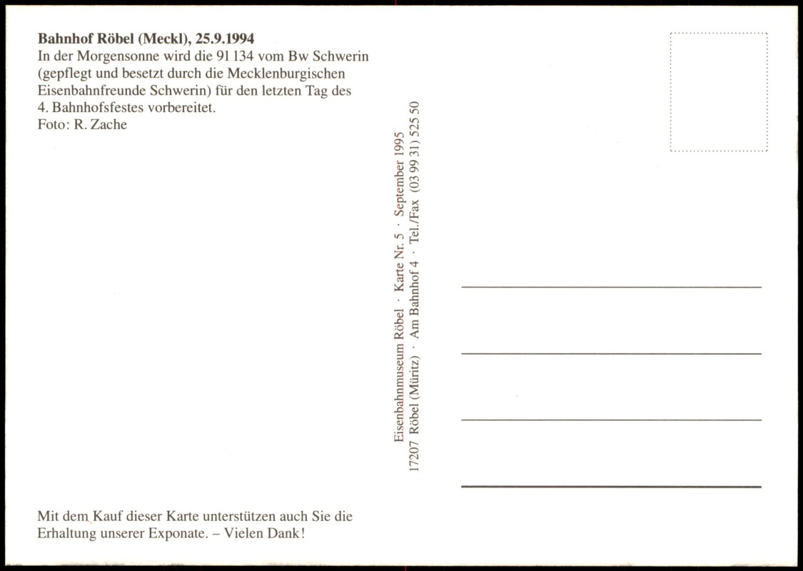 - Die Ansichtskarte zeigt die Dampflokomotive 91 134 des Bw Schwerin, gepflegt und besetzt durch die Mecklenburgischen Eisenbahnfreunde Schwerin, am Bahnhof Röbel (Meckl.) in der Morgensonne. Sie wird für den letzten Tag des 4. Bahnhofsfestes vorbereitet. Das Foto wurde am 25. September 1994 von R. Zache aufgenommen. Die Karte wurde vom Eisenbahnmuseum Röbel (17207 Röbel (Müritz), Am Bahnhof 4) als 'Karte Nr. 5' im September 1995 herausgegeben. Ein Hinweis auf der Karte bittet um Unterstützung zur Erhaltung der Exponate des Museums.