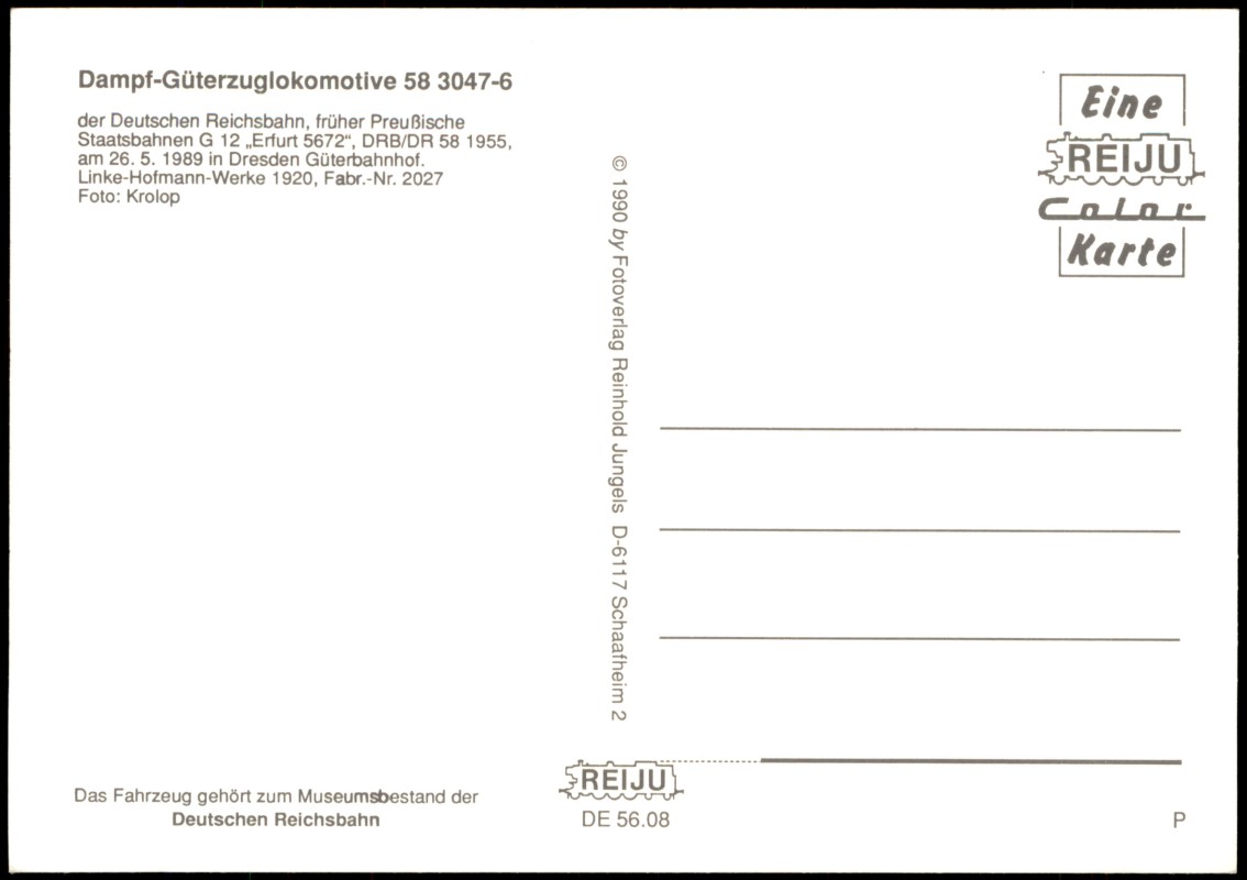 Postcart: Dampf-Güterzuglokomotive 58 3047-6 Güterbahnhof Dresden