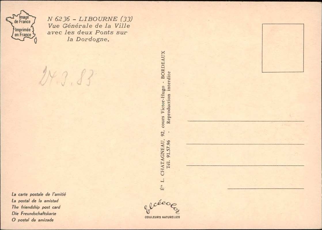 - Luftaufnahme von Libourne mit einer Gesamtansicht der Stadt und den beiden Brücken über die Dordogne. Die Karte wurde von L. Chatagneau, 92, cours Victor-Hugo - Bordeaux, herausgegeben und trägt die Seriennummer N 6236. Sie wurde in Frankreich gedruckt ('Imagede France Imprimée en France') und ist mit dem Branding 'Elcécolor COULEURS NATURELLES' versehen. Der Text 'Reproduction interdite' weist auf Urheberrechtsschutz hin. Die Karte ist auch als 'The friendship post card' in mehreren Sprachen bezeichnet.
