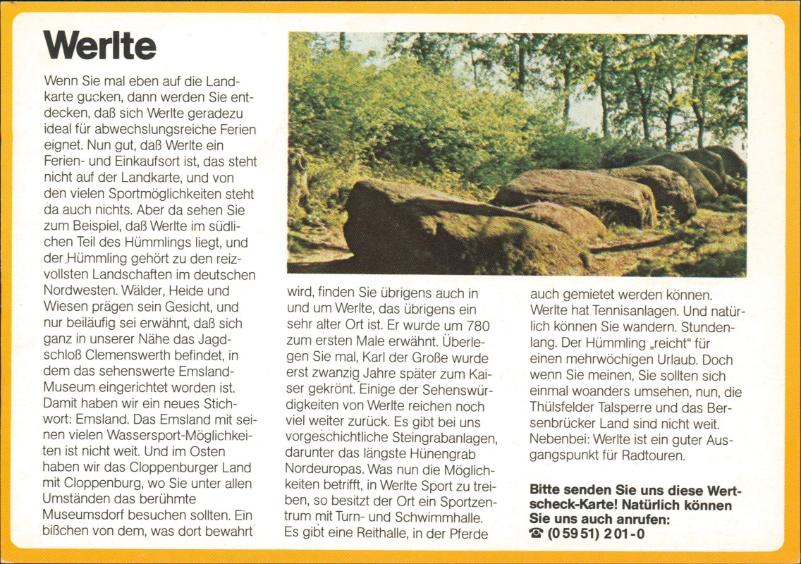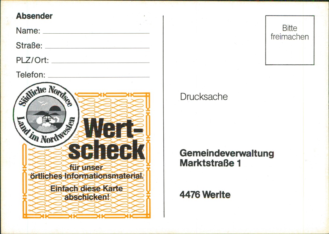 you can buy this card here:- Werlte Bild-Postkarte mit Ortsansicht, Drucksache Antwortkarte "Wertscheck" 1980