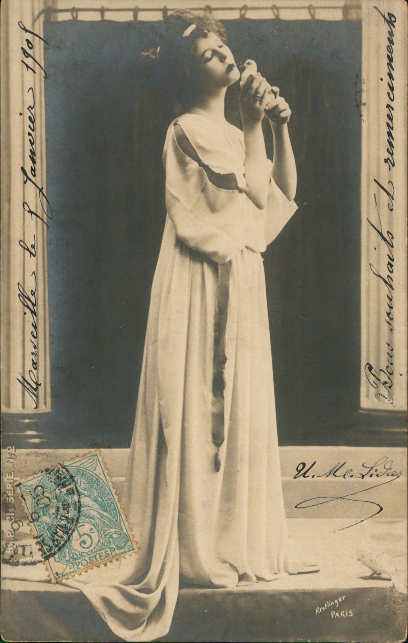 Postcart: Schöne Frau im weißen mit Taube - Fotokunst