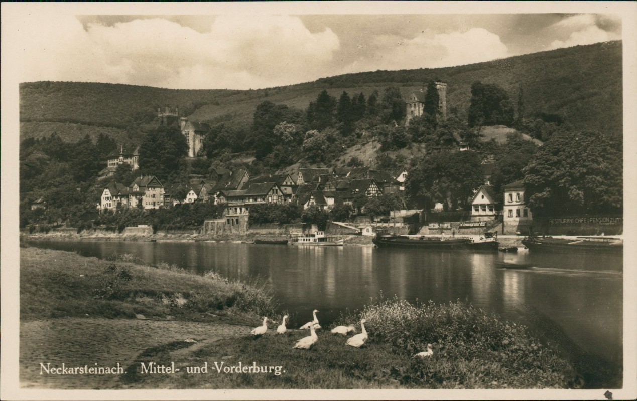 Postcart: Mittel- und Vorderburg. Schiff Gänse - Neckarsteinach