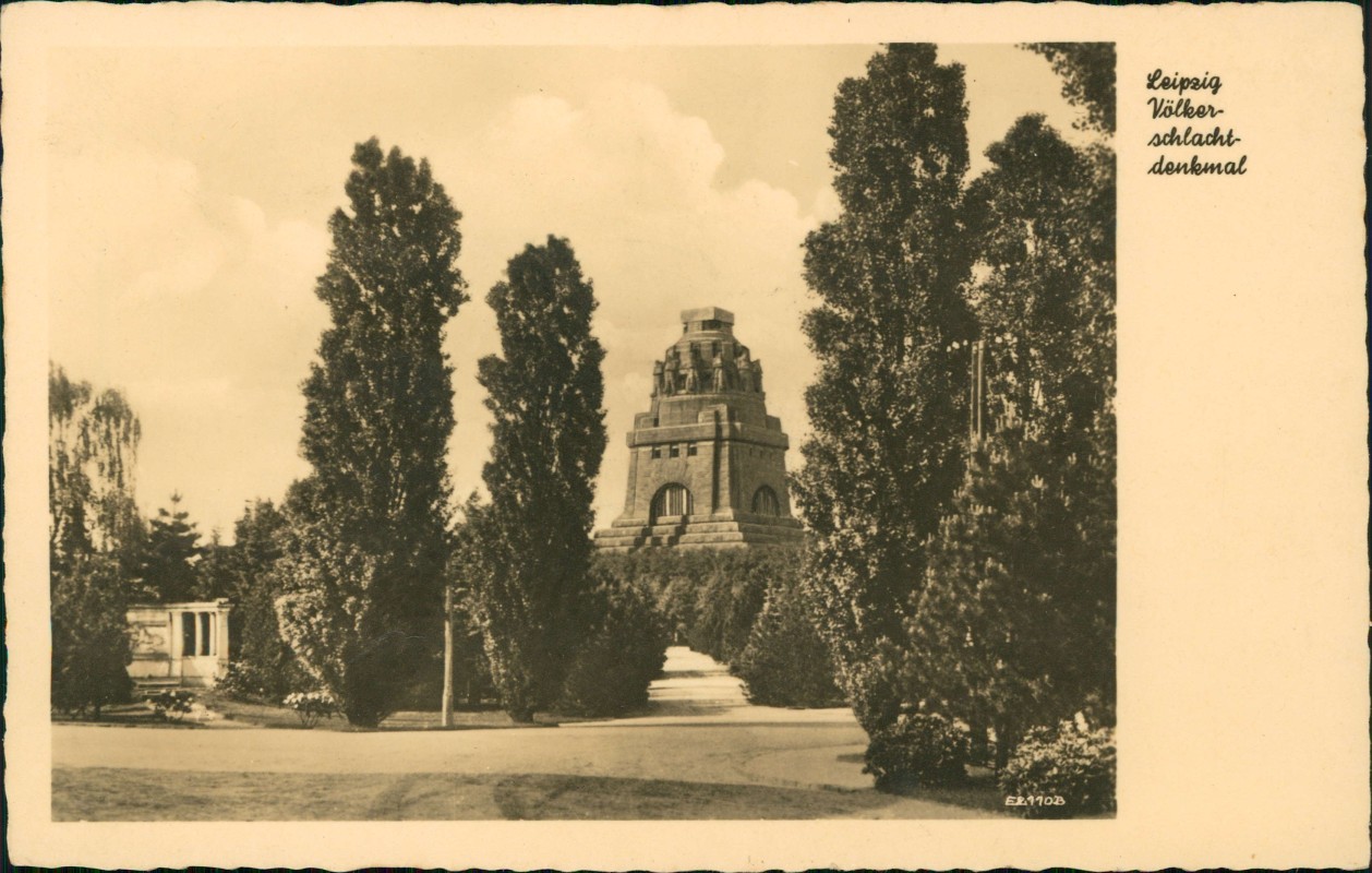 - Völkerschlachtdenkmal durch die Bäume gesehen Fotokarte