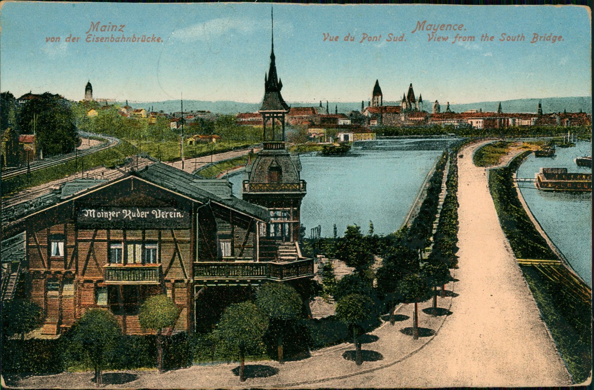 Postcart: Panorama-Ansicht von der Eisenbahnbrücke Mainzer Ruder Verein - Mainz
