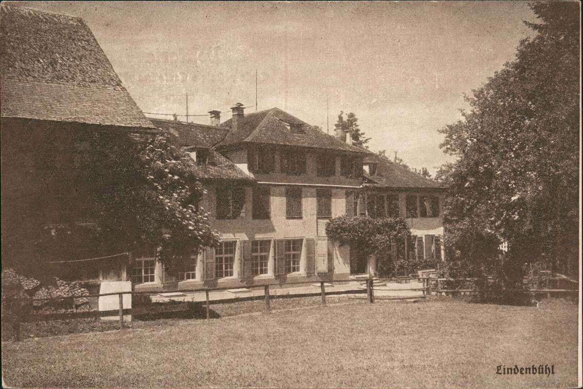 - Die Postkarte zeigt eine sepiafarbene fotografische Ansicht eines großen, mehrstöckigen Gebäudes mit dem Namen 'Lindenbühl'. Das Bauwerk weist zahlreiche Fenster mit Fensterläden auf und ist von Bäumen und einer eingezäunten Rasenfläche im Vordergrund umgeben. Der Name 'Lindenbühl' ist unten rechts auf der Bildseite aufgedruckt. Die Rückseite ist ungeteilt und enthält den standardmäßigen Postkarten-Header in drei Sprachen.