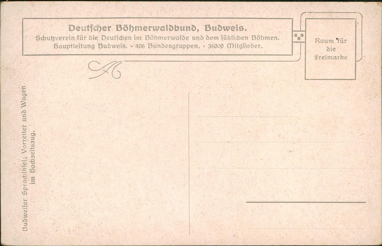 Postcart: Budweiser Sprachinsel; Vorreiter und Wagen Hochzeitszug. - Budweis