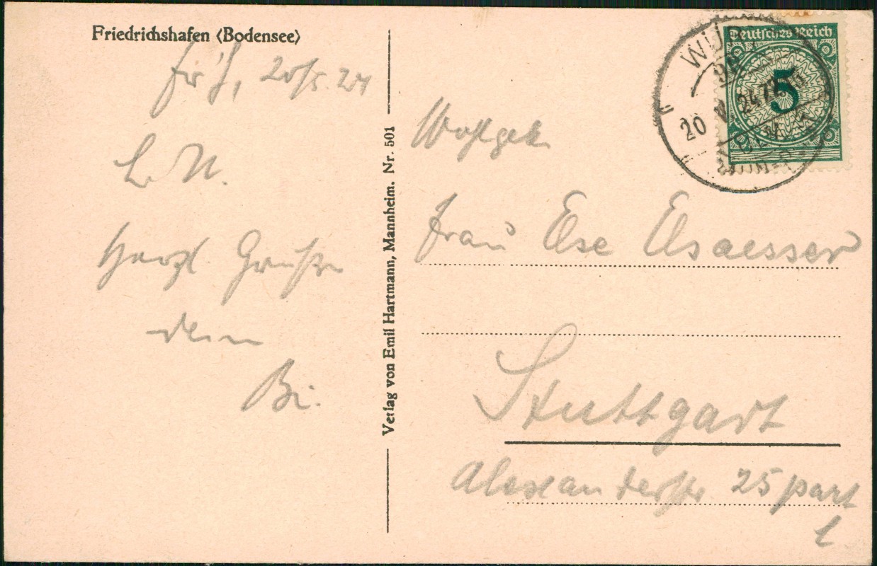 vintage Postcard from 1924: Hafen Bassin:: Friedrichshafen Address side