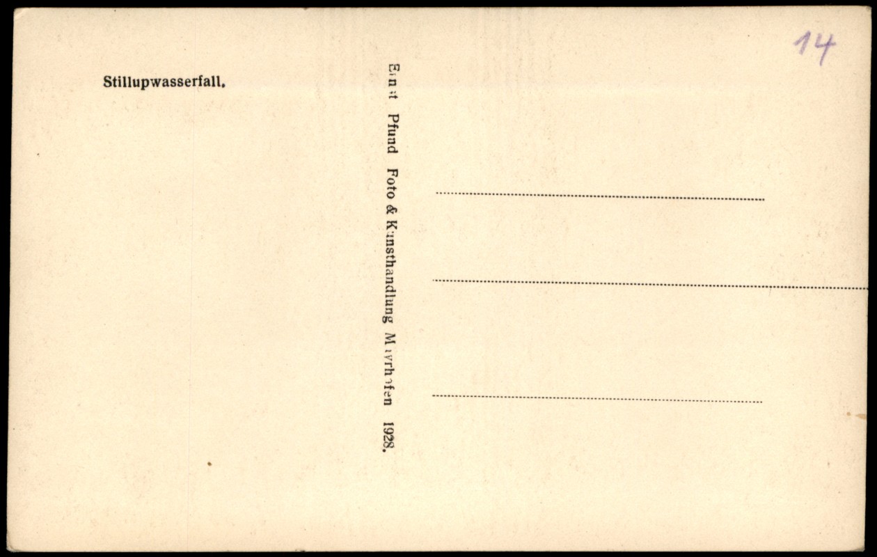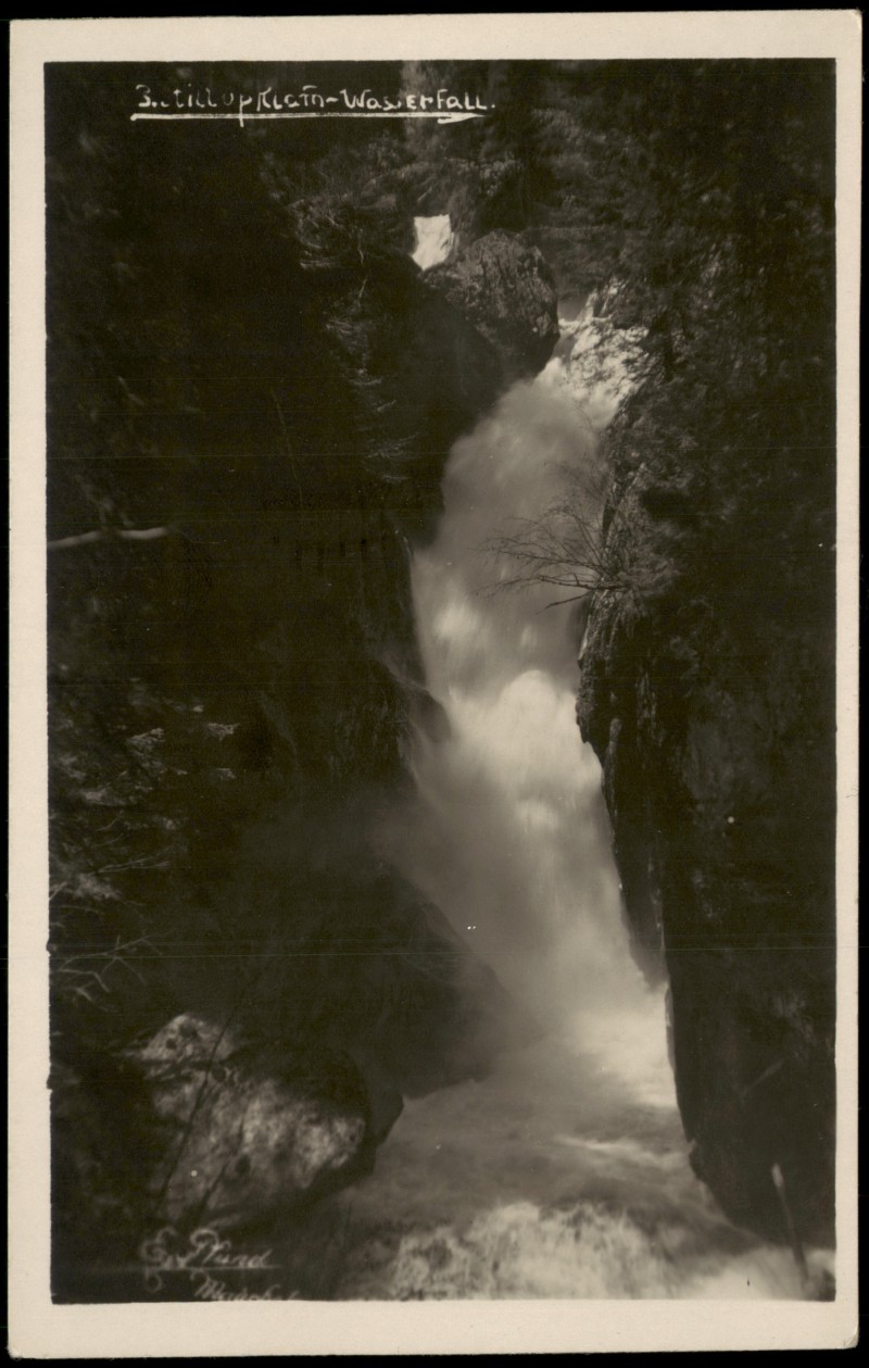 - Echtfoto-Postkarte (RPPC) mit einer Ansicht des Stillupwasserfalls in einer felsigen Schlucht. Die Karte wurde von der Foto- & Kunsthandlung Ernst Pfund in Mayrhofen herausgegeben. Der Druck vermerkt das Jahr 1928.