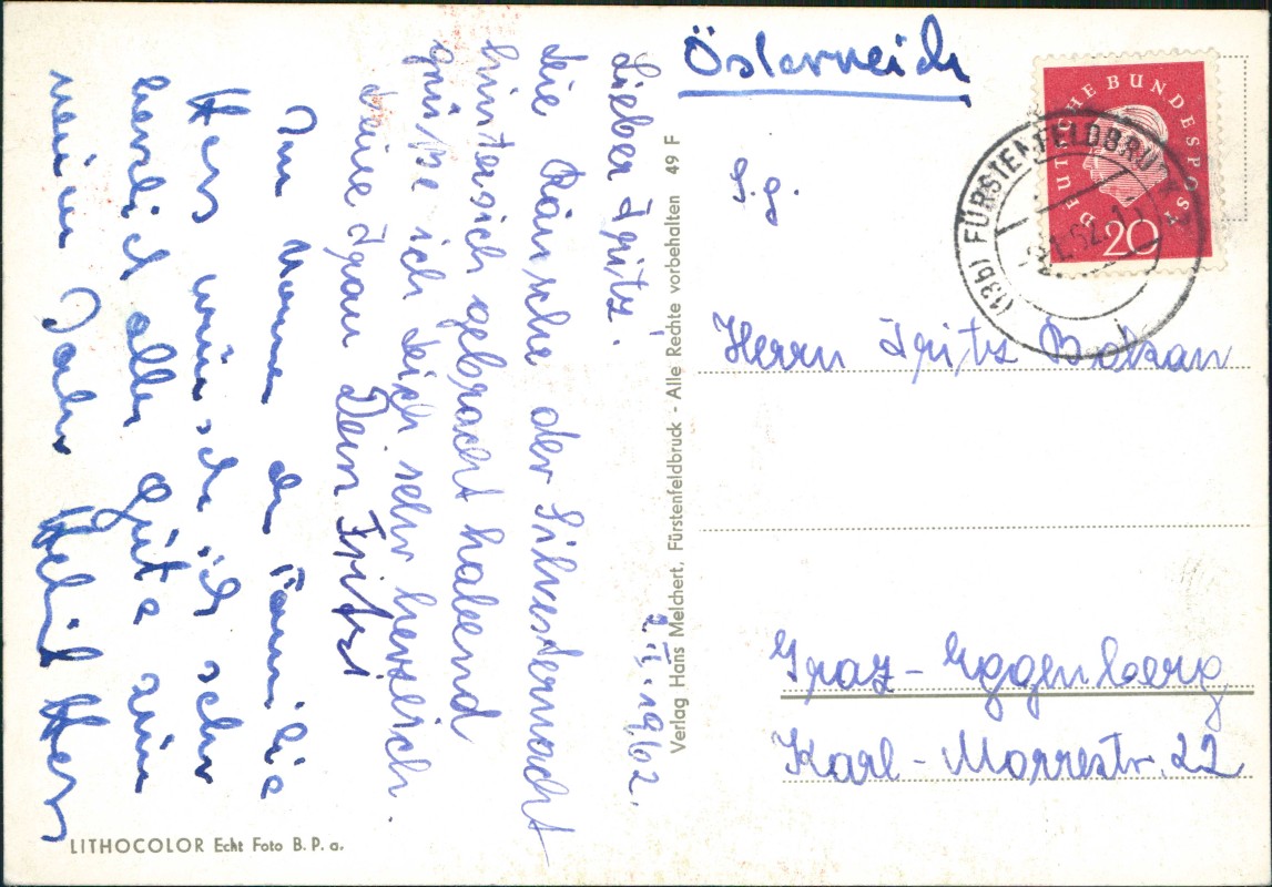 - Echt-Foto-Ansichtskarte (Lithocolor) des Alten Rathauses in Fürstenfeldbruck. Das markante rote Gebäude mit Treppengiebel und Uhr steht im Zentrum. Im Vordergrund ist ein steinerner Brunnen sichtbar, im Hintergrund der Turm einer Kirche. Herausgegeben vom Verlag Hans Melchert, Fürstenfeldbruck.