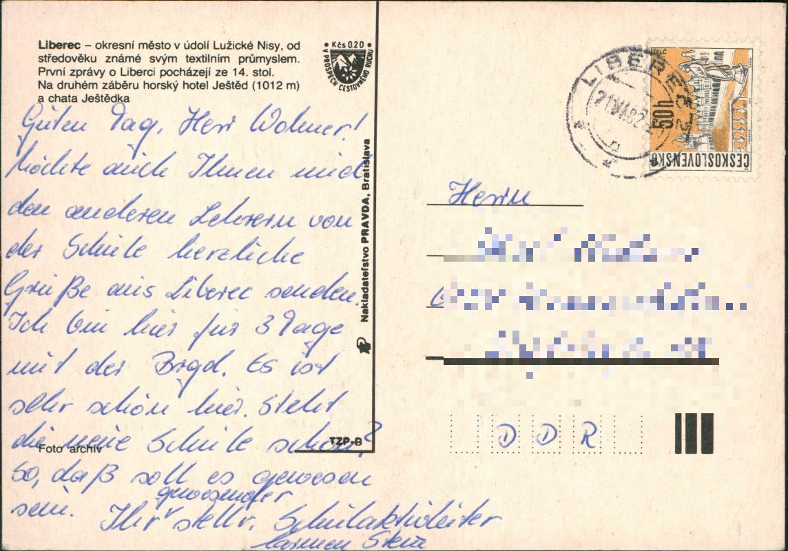- Farbige Mehrbildkarte aus Liberec (Reichenberg) mit vier verschiedenen Ansichten: Oben links das F. X. Šalda Theater, oben rechts der markante Fernsehturm und das Berghotel Ještěd (Jeschken), unten links das historische Rathaus und unten rechts das moderne Kaufhaus Ještěd (Obchodní dům Ještěd). Die Rückseite enthält einen tschechischen Kurztext zur Stadtgeschichte und zur Höhe des Ještěd (1012 m).