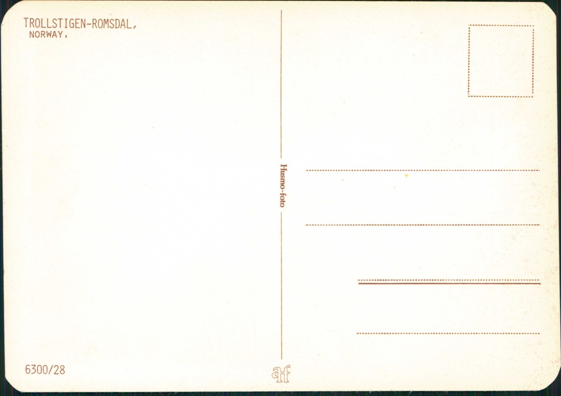 - Hochformatige Farbfotografie eines imposanten Wasserfalls, der durch eine felsige Schlucht im Romsdal am Trollstigen in Norwegen fließt. Im Hintergrund sind schneebedeckte Bergflanken unter einem leicht bewölkten Himmel zu sehen. Die Karte trägt den Aufdruck 'TROLLSTIGEN-ROMSDAL, NORWAY.' und wurde von Husmo-foto veröffentlicht. Die Rückseite ist ungeteilt mit Adresslinien und dem Kürzel 'af' am unteren Rand.
