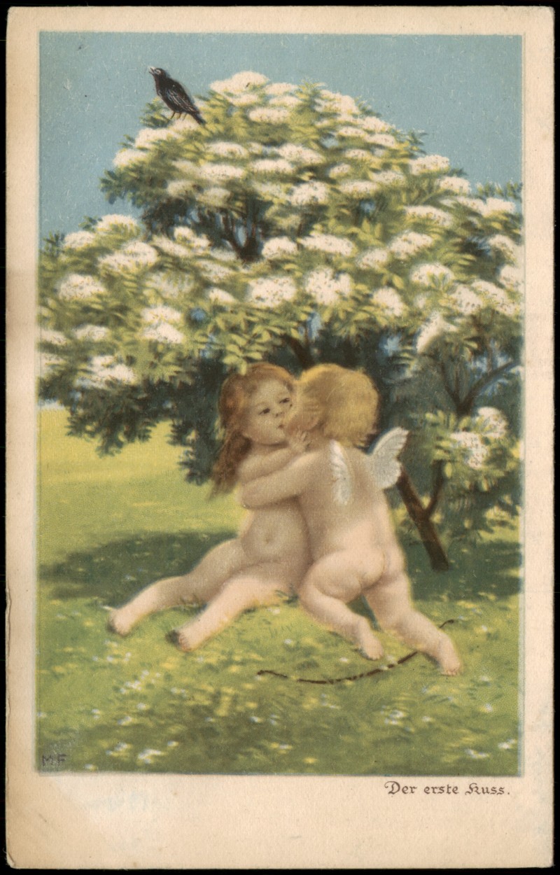 Postcart: Engel Angel Künstlerkarte Der erste Kuss. unter dem Baum