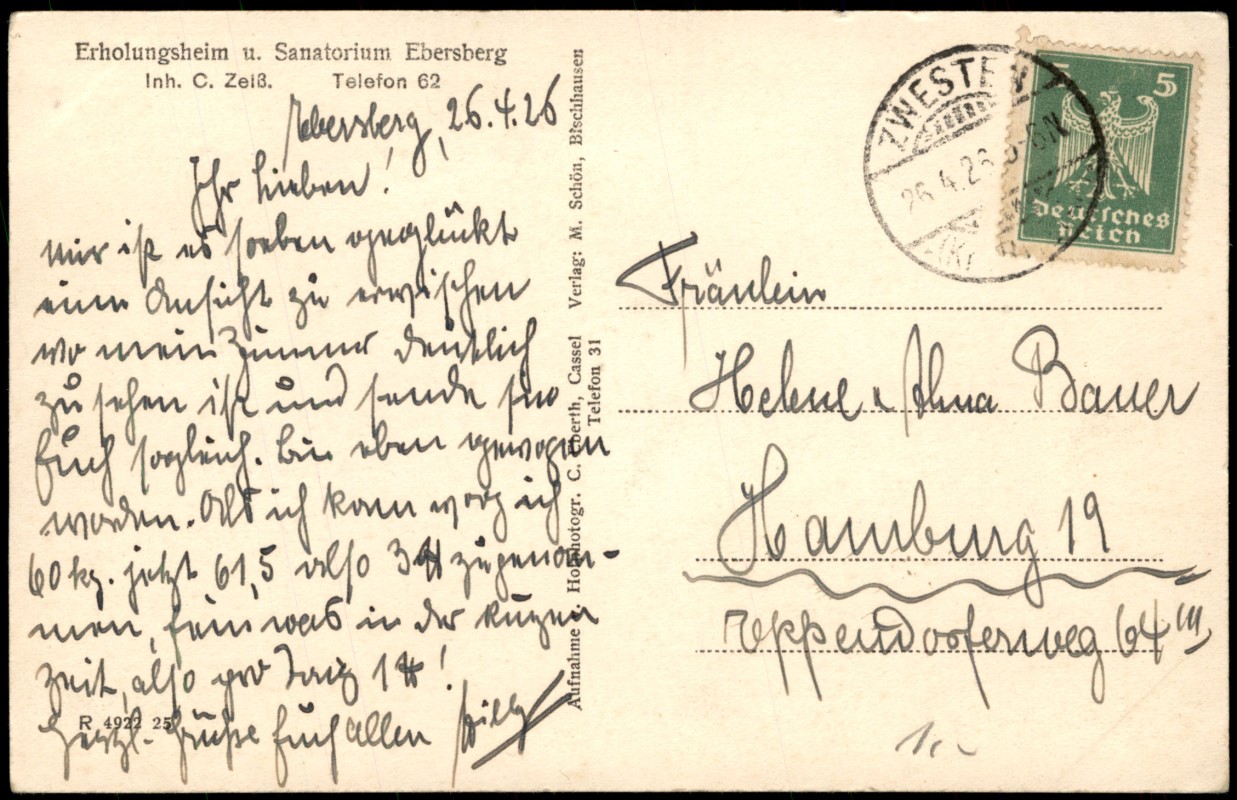 vintage Postcard from 1926: Erholungsheim und Sanatorium:: Bad Zwesten-Bad Wildungen Address side