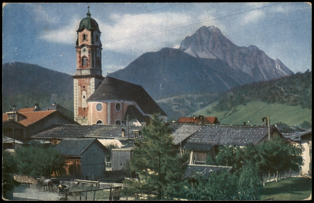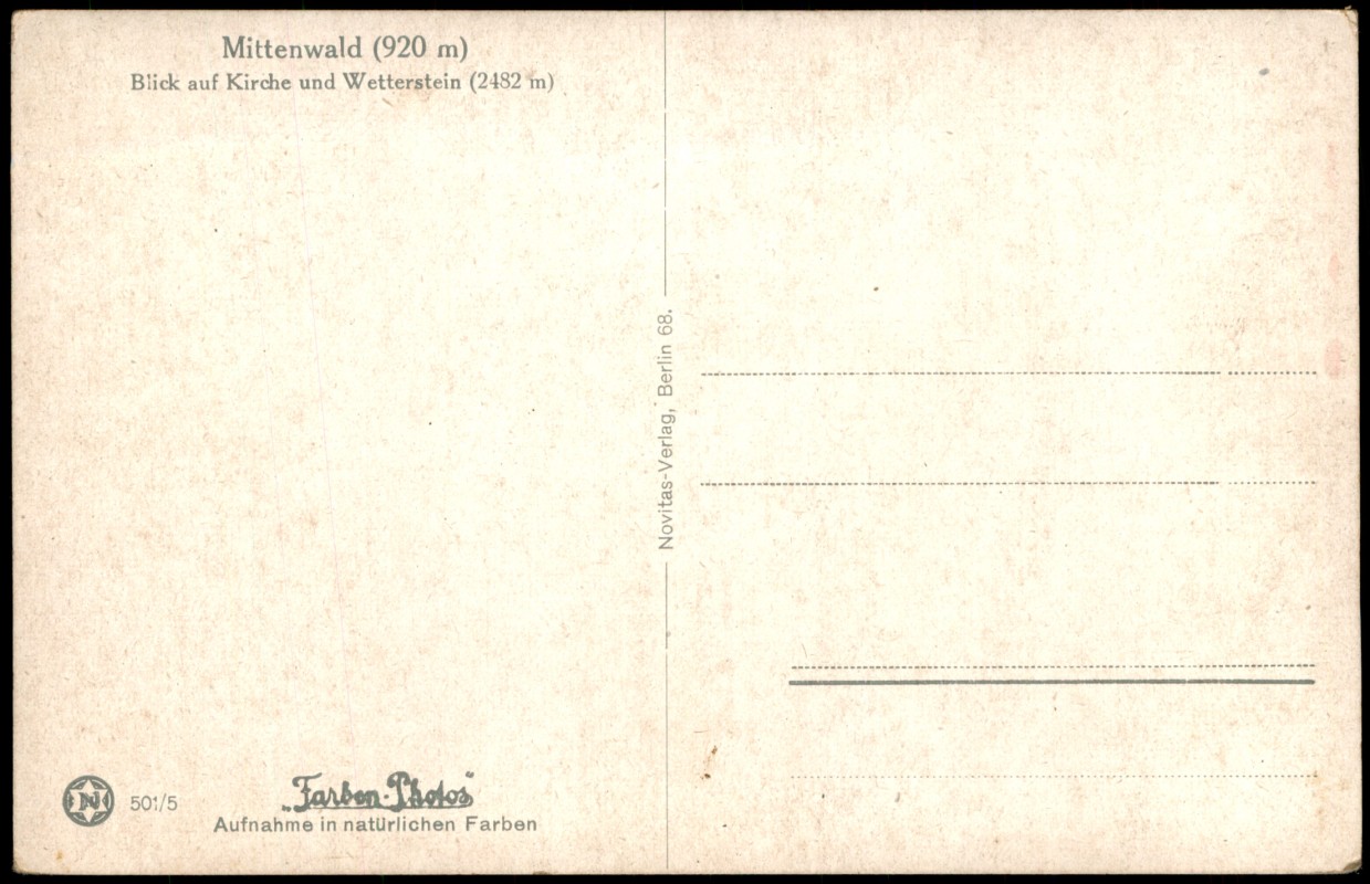 - Farbige Ansichtskarte von Mittenwald. Die Aufnahme zeigt im Vordergrund die barocke Pfarrkirche St. Peter und Paul und im Hintergrund das Wettersteingebirge. Herausgegeben vom Novitas-Verlag, Berlin 68, als Teil der Serie 'Farben-Photos'.