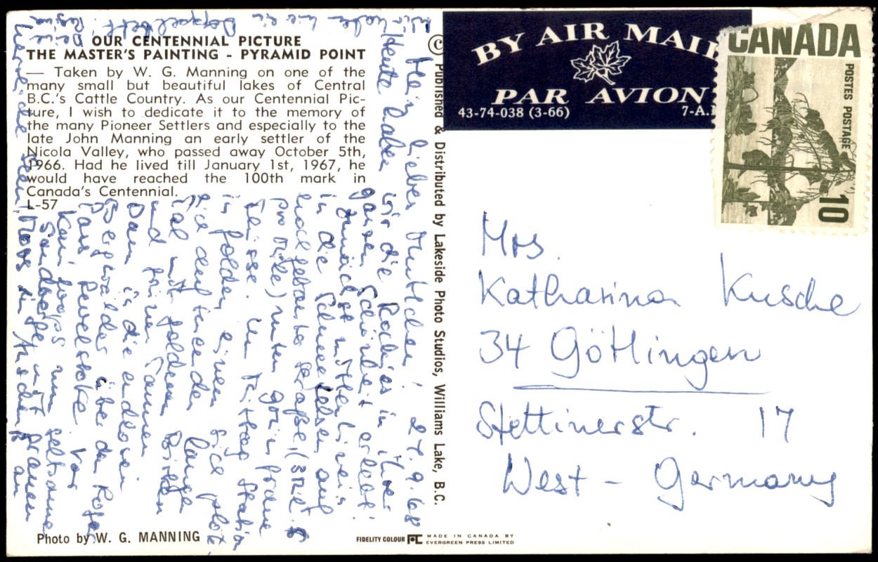 - Farbfotografie von W. G. Manning mit dem Titel 'The Master's Painting - Pyramid Point'. Das Motiv zeigt einen pyramidenförmigen Hügel und dessen Spiegelung in einem See im Cattle Country von Central British Columbia, Kanada. Die Karte wurde als 'Centennial Picture' zur 100-Jahr-Feier Kanadas (1967) herausgegeben und enthält eine Widmung an den Pionier John Manning aus dem Nicola Valley. Gedruckt von Evergreen Press Limited für Lakeside Photo Studios.