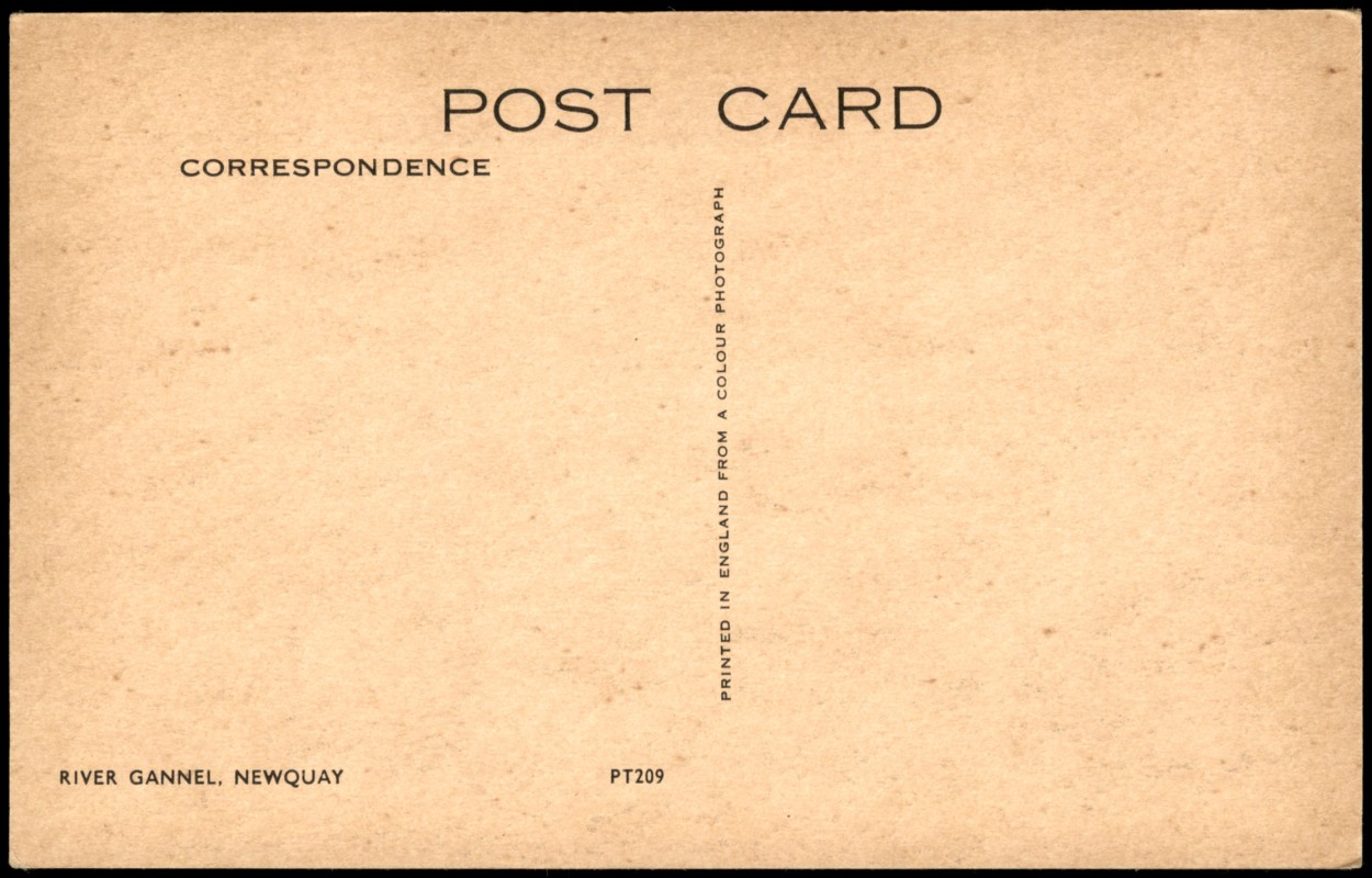 - Farbfotografische Ansicht des River Gannel bei Newquay. Die Aufnahme zeigt den weiten Flusslauf der Gezeitenmündung, umgeben von einer hügeligen Küstenlandschaft. Die Karte wurde in England gedruckt und trägt die Seriennummer PT209.