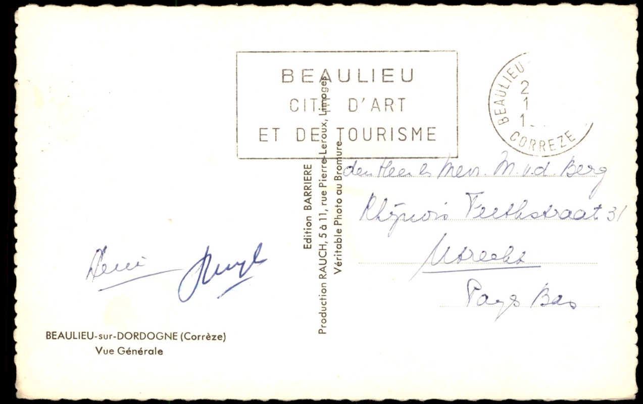 - Echte Fotografie (Véritable Photo au Bromure) mit einer Gesamtansicht (Vue Générale) von Beaulieu-sur-Dordogne. Die Aufnahme zeigt den Ort vom gegenüberliegenden Ufer der Dordogne aus. Im Stadtbild sind die markanten Türme der Abteikirche Saint-Pierre erkennbar. Herausgegeben von Production RAUCH, Limoges, in der Edition BARRIERE.