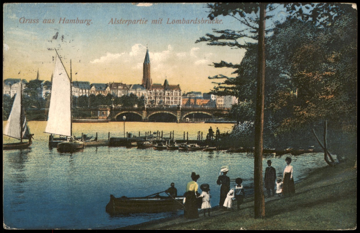 Postcart: Alsterpartie mit Lombardsbrucke. Spaziergänger - Hamburg