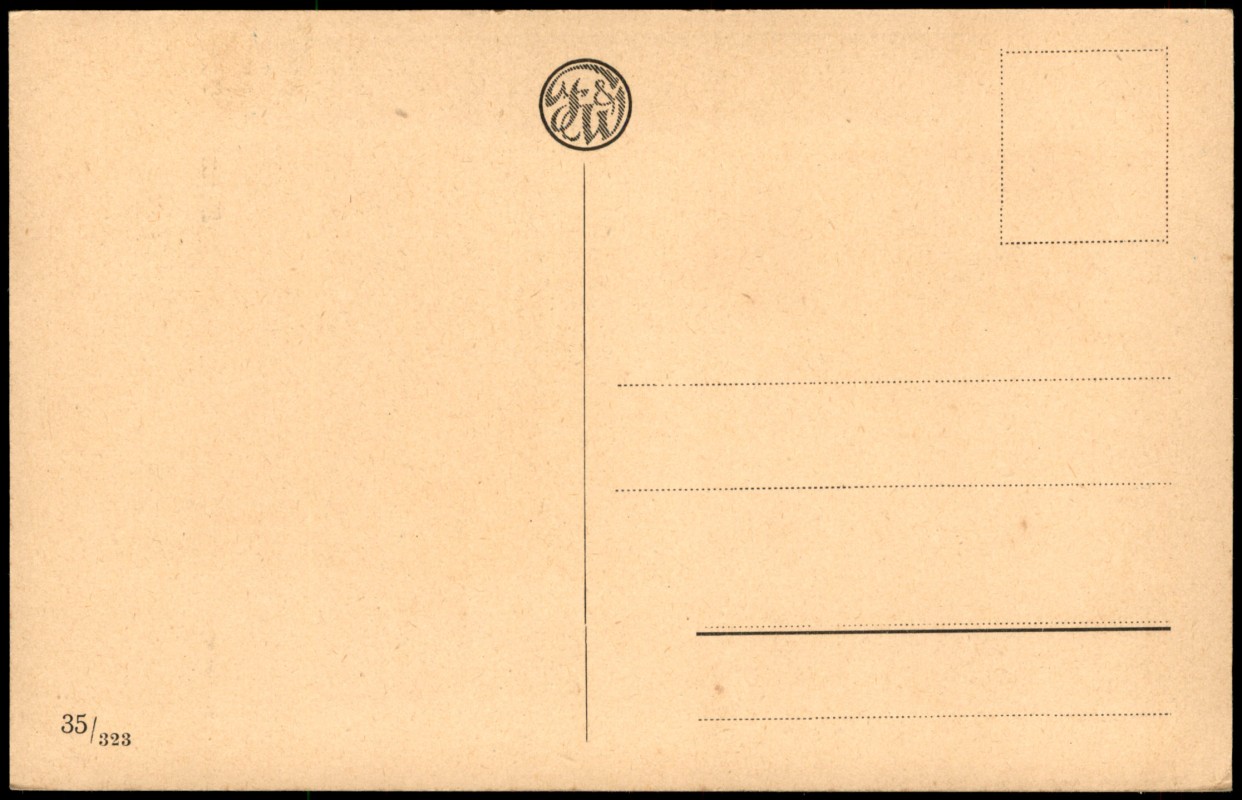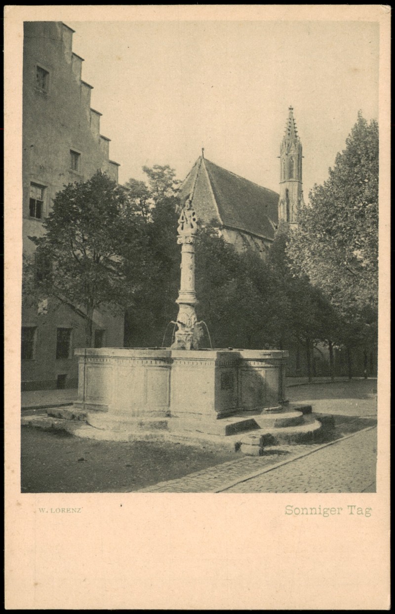 - Schwarz-Weiß-Ansicht des Tugendbrunnens in Nürnberg. Im Hintergrund ist die markante Architektur der Lorenzkirche erkennbar, links im Bild ein Teil des Nassauer Hauses mit Treppengiebel. Die Karte ist mit 'Sonniger Tag' betitelt.