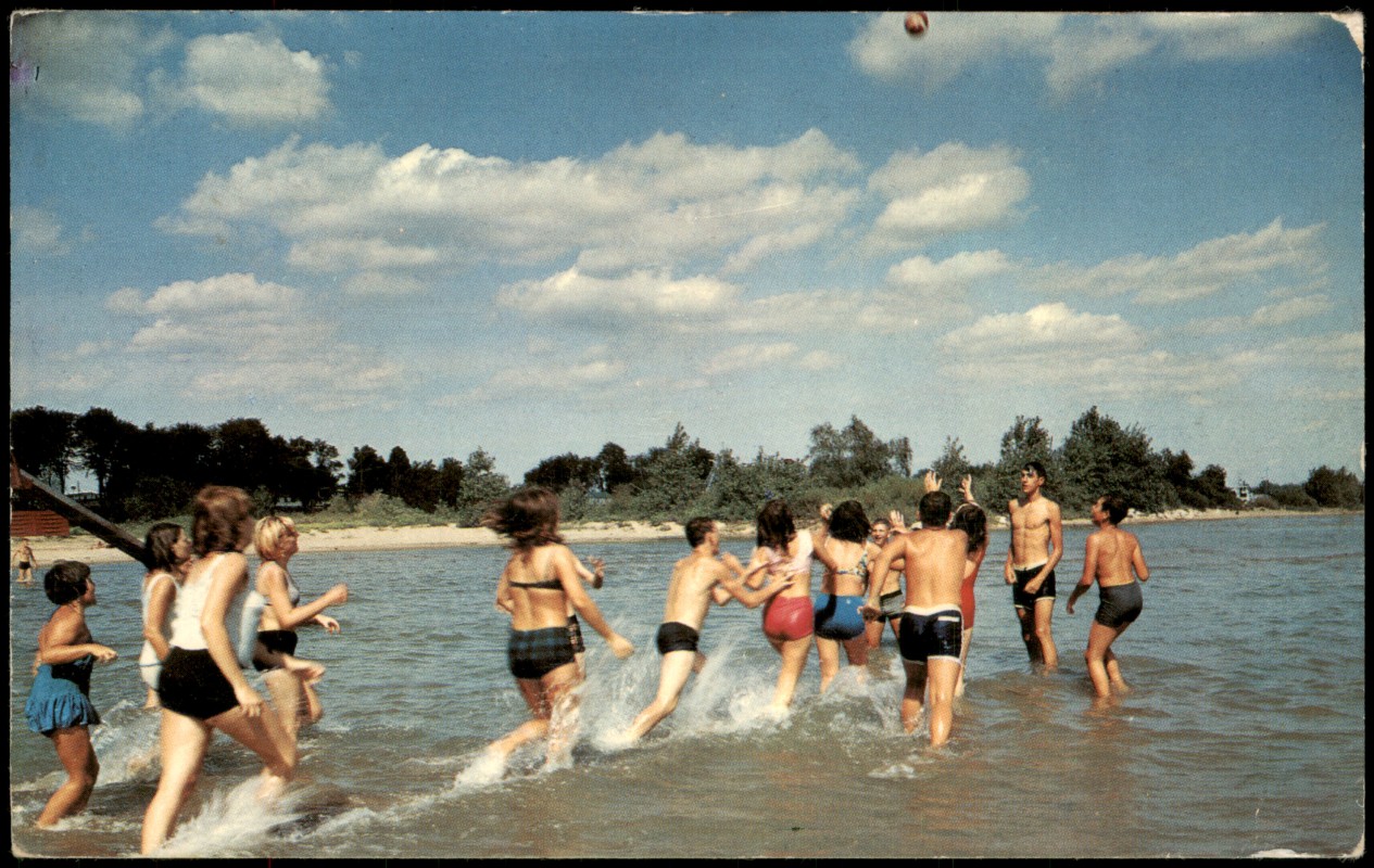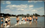 - Farbfotografie (Prismaflex COLOR) einer Gruppe von Jugendlichen in Badekleidung, die am Ufer eines Gewässers ins Wasser laufen. Die Karte trägt den rückseitigen Titel 'Fun and frolic in the sun'. Herausgegeben von Alex Wilson Publications Limited, Dryden, Ontario. Lithographiert in Kanada.