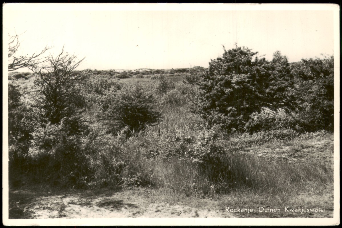 - Echte Fotografie (Real Photo) der Dünenlandschaft Kwakjeswater. Die Aufnahme zeigt die natürliche Vegetation und Dünenformationen des Gebiets. Herausgegeben von De Reproductie Compagnie (DRC), Rotterdam. Gedruckter Titel unten rechts auf der Vorderseite.